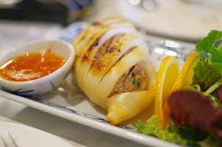 The marinated minced chicken, stuffed in calamari grilled served with ispicy lemon sauce is enticing but slightly disappointing. The idea of charcoal grilled calamari is a good thing. Its tender, grilled pretty much perfectly and firm. It just doesn't quite have the firmness or flavour of calamari you get straight from the market. This is kind of standard for restaurant calamari. The chicken filling however is great and the dish as a whole tastes very good with the accompanying lemon (but really sweet chilli sauce).